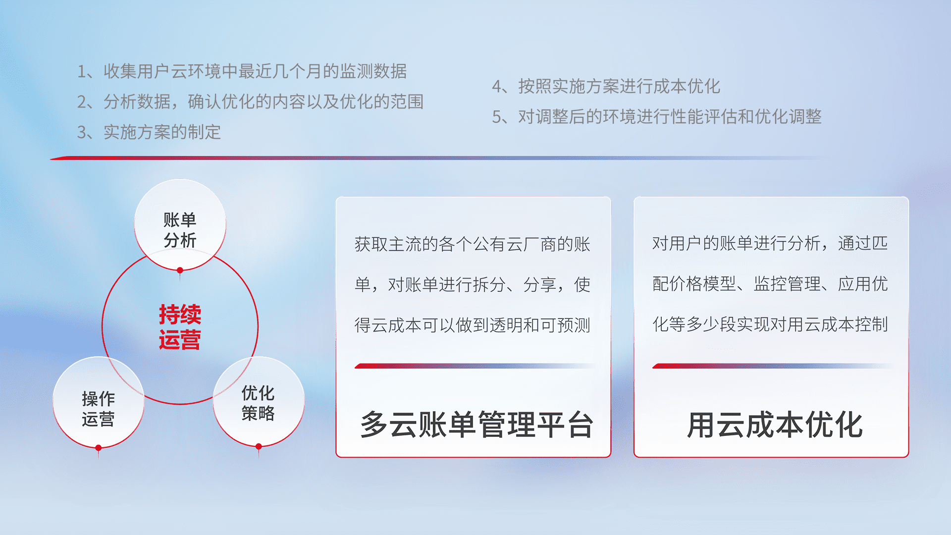 通过多云纳管,,以统一的资源数据模型把客户的云资源进行抽象和封装,,,,进而实现对多云资源的统一操作,,,保障云资源管理的可靠性、、稳定性与可用性。。量身定制化运维内容,,,配置、、开发运维、、、补丁管理、、、备份、、、、监控、、、、认证和访问管理、、、、审计和日常巡检等,,,,保障在用云过程中的可靠度,,,稳定度以及高可用率。。。